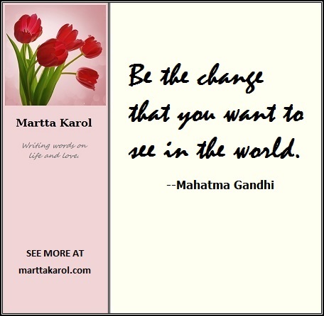 1. I like the quote, “Be the change that you want to see in the world” by Mahatma Gandhi. I am human and have imperfections. But that quote helps remind me to be the best human that I can be.